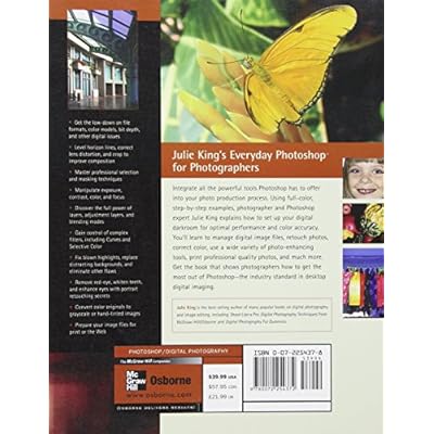 From the Back Cover Integrate all the powerful tools Photoshop has to offer into your photo production process. Using full-color, step-by-step examples, photographer and Photoshop expert Julie King explains how to set up your digital darkroom for optimal performance and color accuracy. You’ll learn to manage digital image files, retouch photos, correct color, use a wide variety of photo-enhancing tools, print professional quality photos, and much more. Get the book that shows photographers how to get the most out of Photoshop--the industry standard in desktop digital imaging. Get the low-down on file formats, color models, bit depth, and other digital issues Level horizon lines, correct lens distortion, and crop to improve composition Master professional selection and masking techniques Manipulate exposure, contrast, color, and focus Discover the full power of layers, adjustment layers, and blending modes Gain control of complex filters, including Curves and Selective Color Fix blown highlights, replace distracting backgrounds, and eliminate other flaws Remove red-eye, whiten teeth, and enhance eyes with portrait retouching secrets Convert color originals to grayscale or hand-tinted images Prepare your image files for print or the Web Julie King is the best-selling author of many popular books on digital photography and image editing, including Shoot Like a Pro: Digital Photography Techniques from McGraw-Hill/Osborne and Digital Photography For Dummies. Read more About the Author JULIE ADAIR KING (Indianapolis, IN) is the best-selling author of numerous popular books about digital photography and image-editing, including Digital Photography for Dummies. She has been a guest on many nationally syndicated and local radio and television shows. Read more